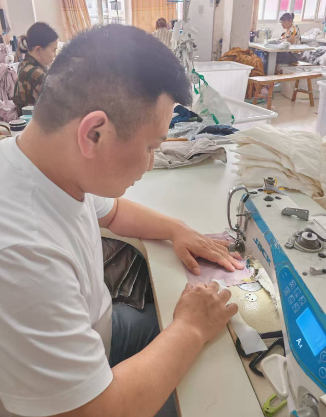 1997年退役后,吳金紅面對家鄉(xiāng)薄弱的產(chǎn)業(yè)基礎(chǔ),毅然選擇外出闖蕩。他在浙江的服裝廠從基層縫紉工做起,每天與針線、布料為伴。為快速掌握技術(shù),他主動申請上夜班,利用設(shè)備空閑時間反復(fù)練習(xí)鎖邊、裁剪、整燙等工藝,手指被針尖扎破上百次,3個月便獨(dú)立操作流水線。2010年返鄉(xiāng)創(chuàng)業(yè)初期,他抵押資產(chǎn)購置二手縫紉機(jī),進(jìn)行作坊式加工,接單修補(bǔ)工裝、校服,以“針腳細(xì)密、交貨準(zhǔn)時”贏得口碑,一年內(nèi)將作坊擴(kuò)至6人規(guī)模。經(jīng)過十余年的發(fā)展,目前已形成覆蓋六十余人、多個車間的服裝公司。