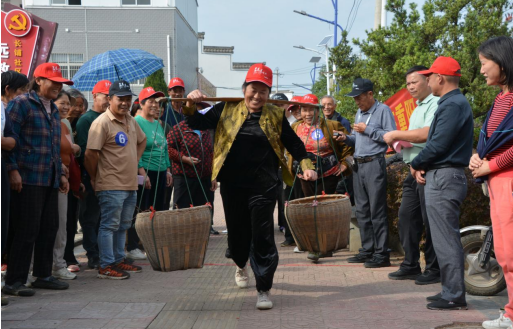 當拔河賽場展現力量之美時,其余五大趣味項目也相繼全面開啟,將運動會變成了歡樂的海洋。在“同心背籃賽”賽場,夫妻、親友組合背靠著背,夾著象征豐收的“糧籃”,協調步調,橫向前行,有趣的“螃蟹式”步伐引得圍觀群眾笑聲不斷。