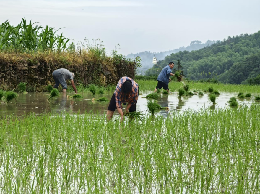 在二郎鎮的水田里,農戶們分工協作、默契配合。有的彎腰于秧苗田,小心翼翼拔起嫩綠秧苗,規整扎把;有的挑著秧苗穿梭田埂,將“希望苗”及時送至插秧區域;更多人則俯身水田,左手分苗、右手插秧,動作嫻熟流暢,一行行整齊的秧苗迅速鋪滿水田,讓荒蕪的泥地煥發出勃勃生機。